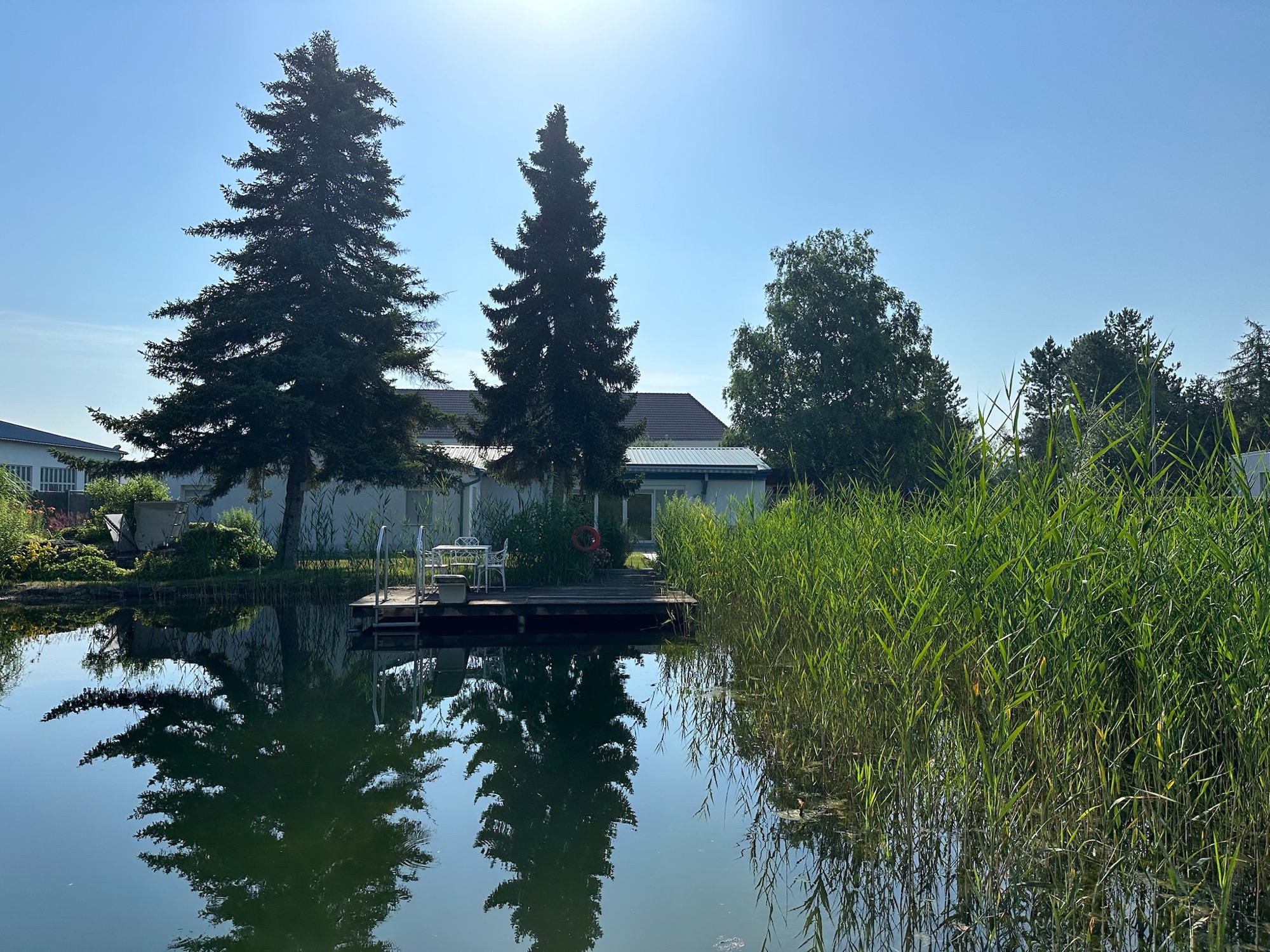 Natur-Badeteich mit Holzsteg, Sprungbrett & Wasserfall